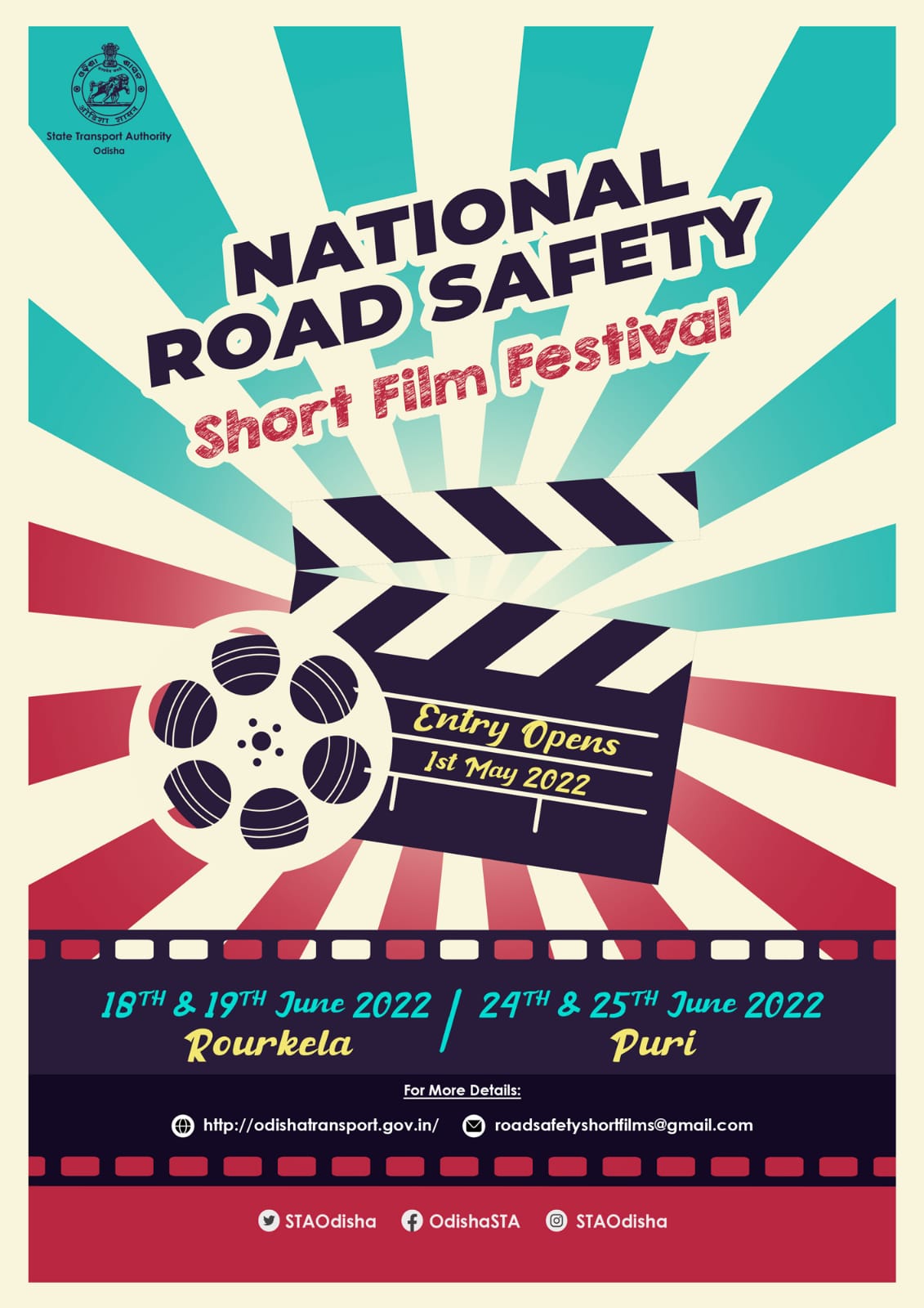 The entries are open for National Road Safety Short Film Festival, a first of its kind festival organized in the country. Last date of entry submission is 3rd June, 2022.The festival aims to raise awareness of road safety issues and promote increased engagement in road safety cooperation in the state of Odisha as well as across the nation to reduce the road accidents and fatalities related to it.