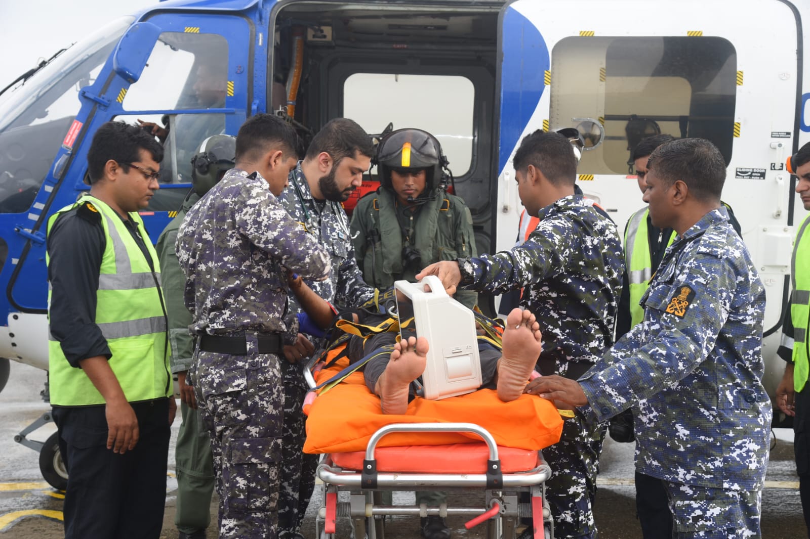 The patient, suffering from a very low pulse and lower body numbness, required immediate medical attention. Responding swiftly, the ICG Air Enclave in Porbandar dispatched an Advanced Light Helicopter (ALH) to the scene despite facing high-intensity winds, heavy rainfall, and generally inclement weather conditions.