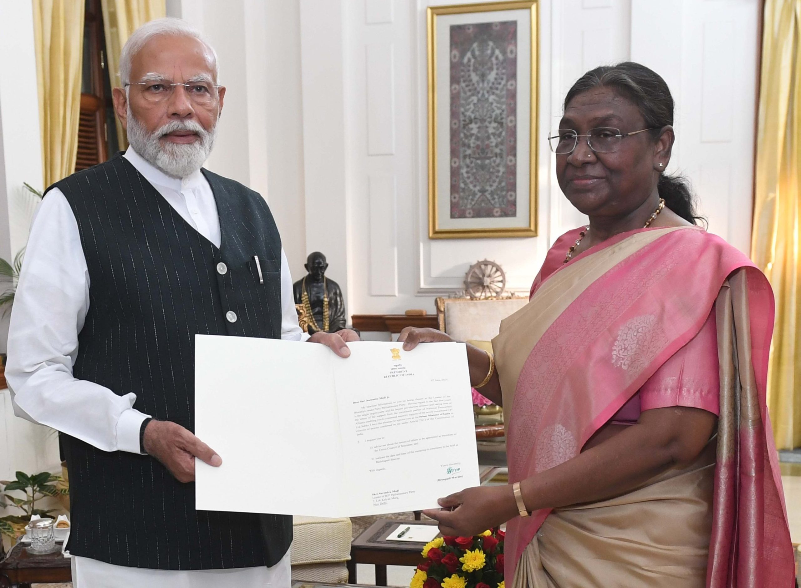“A distinct global image has been built in the last 10 years as India has emerged as a ‘Vishwa Bandhu’. Its maximum advantage will begin now. I am confident that the next five years will be extremely useful for the country as far as the global environment is concerned,” said PM Modi while speaking outside the Rashtrapati Bhavan after meeting President Droupadi Murmu.